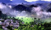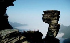 在海拔22 00余米的崇山峻岭上,突兀而起冒出一尊石柱,高约100米,如巨笋出土,似玉龙啸天,红云环绕,直指苍穹。大自然的神工鬼斧,又将山顶一劈为二。两个山顶上分别建有释迦殿、弥勒殿,两殿之间有天桥相连,朝拜的香火烧到了云天之上。还有那独立撑云的蘑菇石、依山望母的太子石、状若册籍的万卷书(山岩)等,形神兼备,令人叹绝!至于梵净山顶部一带常常出现的“佛光”,更是令人魂牵梦绕,一睹为快。水,或涓涓细流,或丁冬垂滴,或白练悬空,或奔腾咆哮,皆异常澄洁。